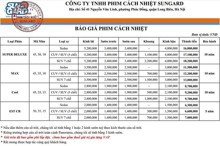 Thông số kỹ thuật Film cách nhiệt SUNGARD cho xe hơi.